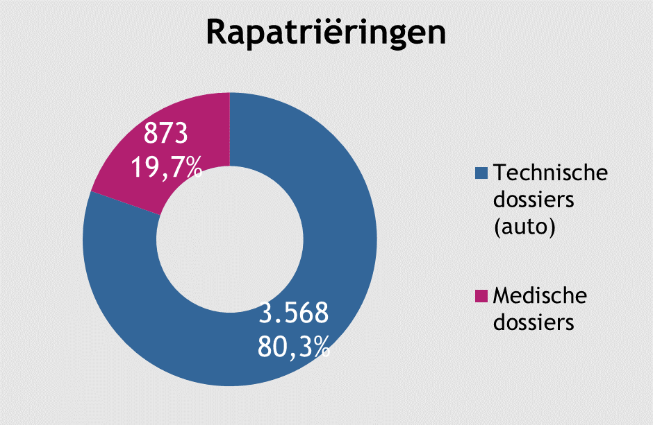 Meestal (9 keer op 10) ging het om autopech of verkeersongeval. Maar er was ook medische hulp nodig voor bijna 12.000 vakantiegangers die een ernstig letsel opliepen of ernstig ziek werden op reis, vaak ver van huis. 873 keer moest iemand om medische redenen uit het buitenland gerepatrieerd worden.